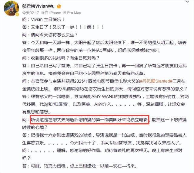 独自在美国庆生的邬君梅透露在生日这一天自己给自己写了一首诗还有一张生日贺卡,当然,远方的朋友们也有送来祝福,邬君梅有一一回复。
