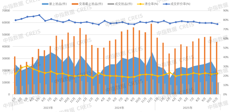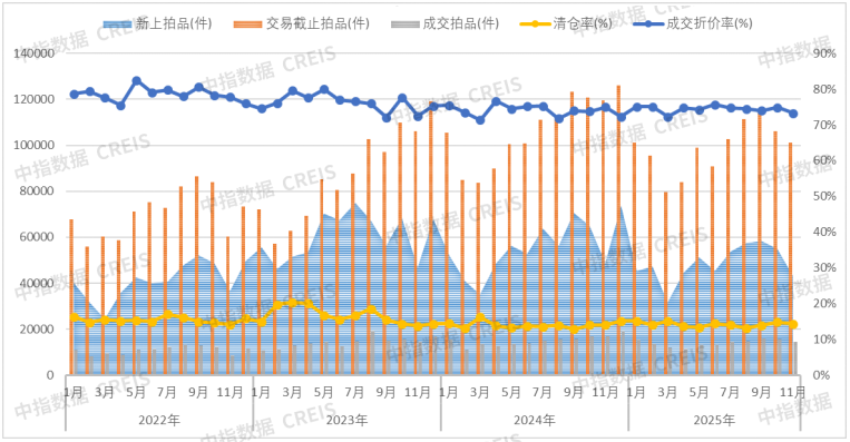 图:2022-2025年11月全国355城法拍市场挂拍、交易趋势