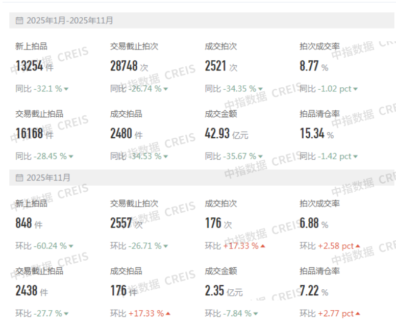 表:2025年1-11月各类法拍房挂拍套数及成交金额